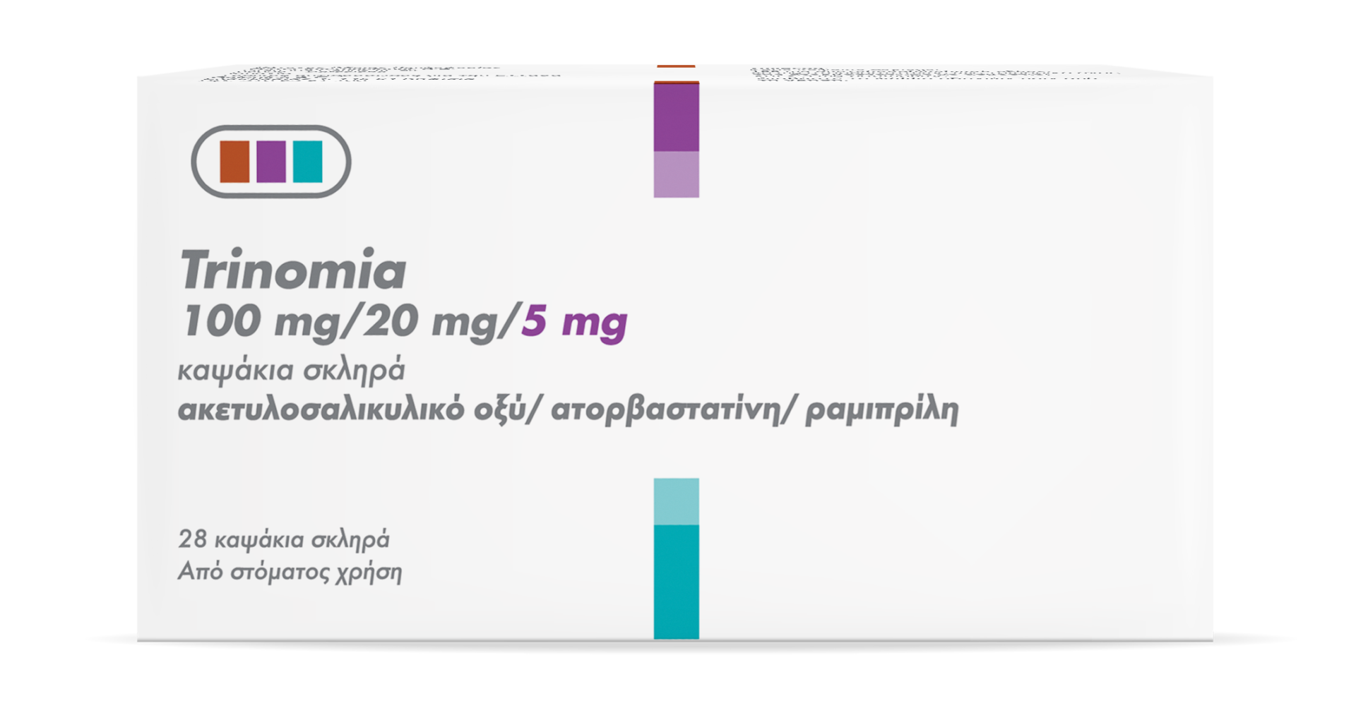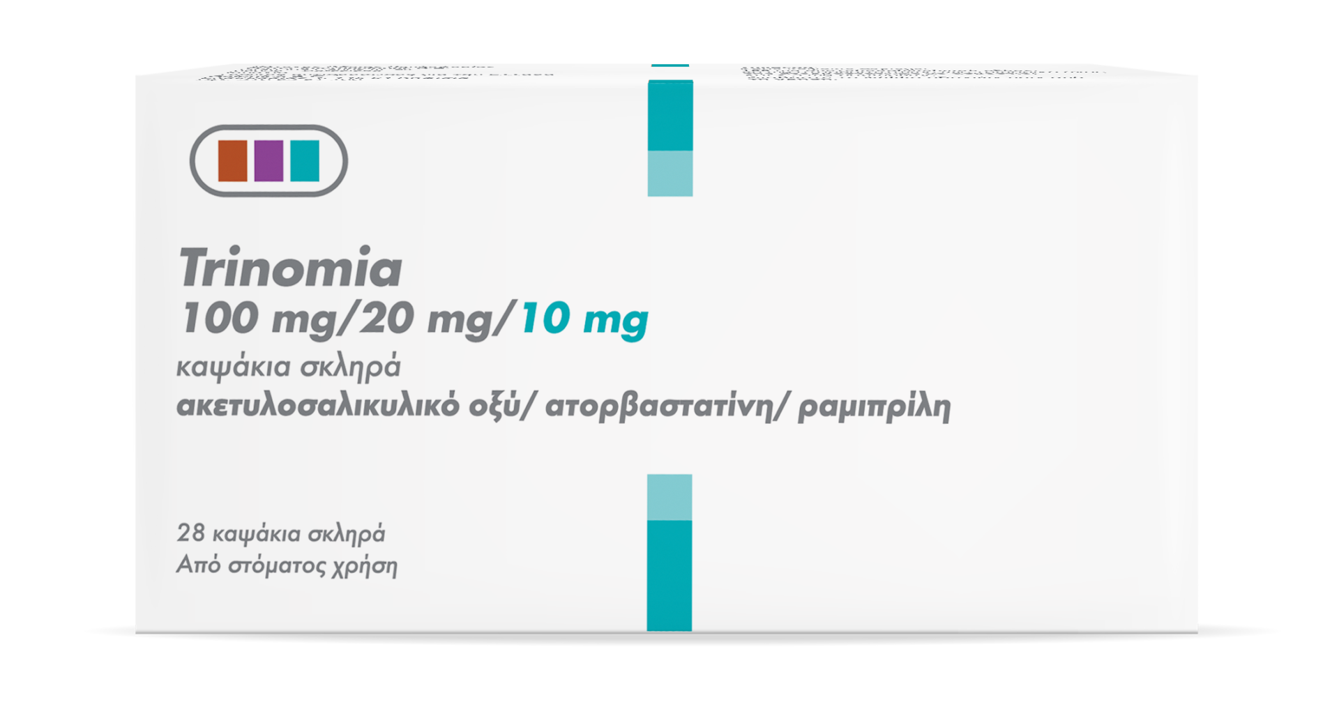 Κάθε καψάκιο περιέχει 100 mg ακετυλοσαλικυλικού οξέος, 20 mg ατορβαστατίνης και 10 mg ραμιπρίλης. - Trinomia 100 mg/20 mg/5 mg καψάκια σκληρά