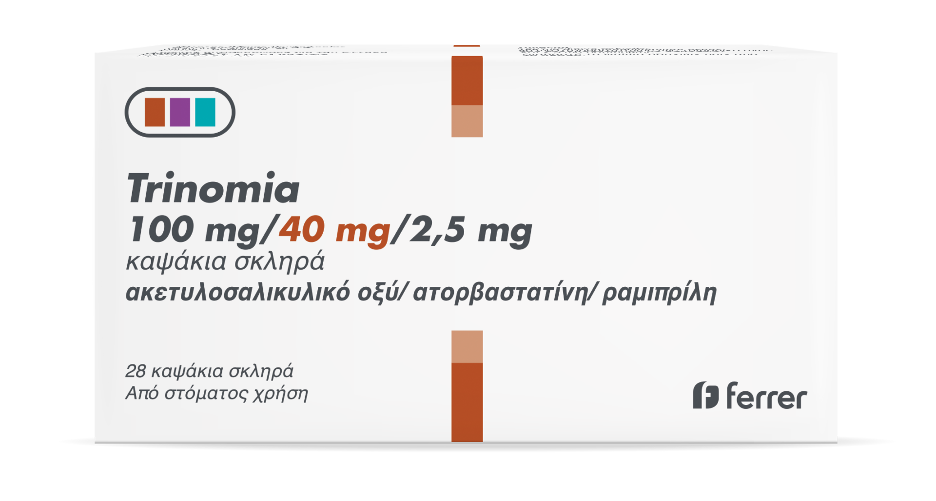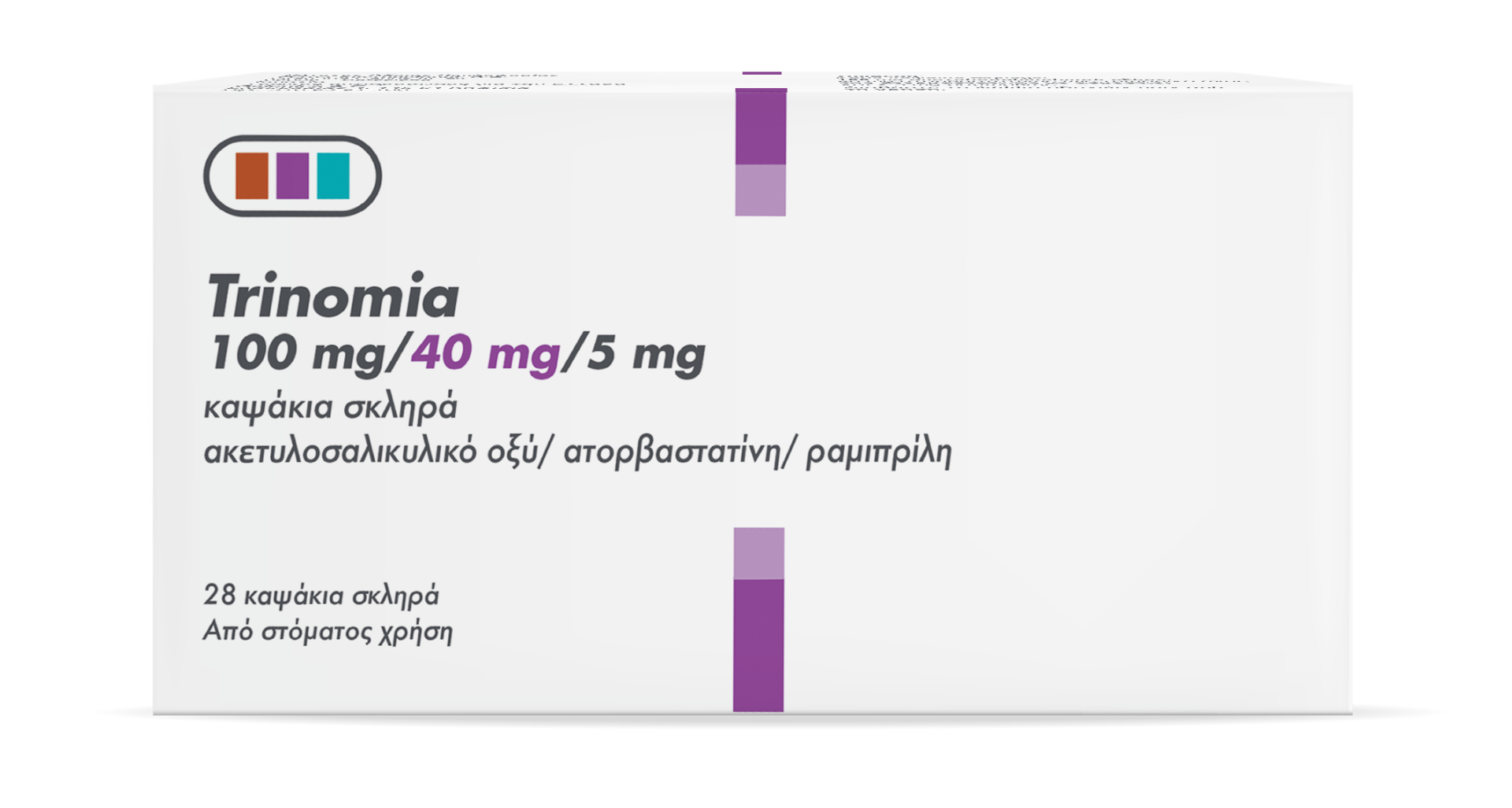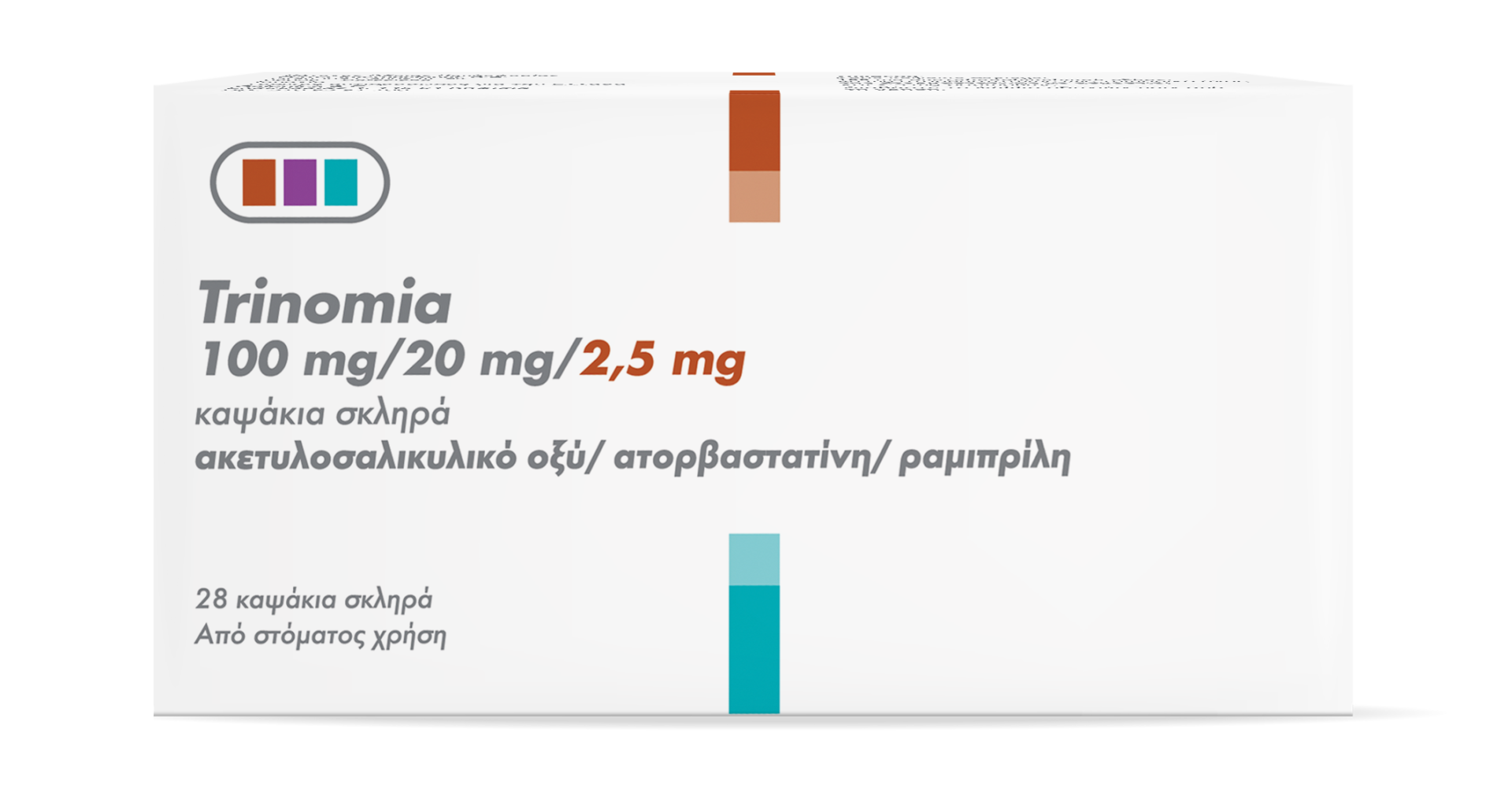 Κάθε καψάκιο περιέχει 100 mg ακετυλοσαλικυλικού οξέος, 20 mg ατορβαστατίνης και 2.5 mg ραμιπρίλης. - Trinomia 100 mg/40 mg/5 mg καψάκια σκληρά
